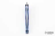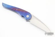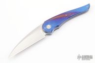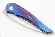 This Ultime Atom linerlock folder by Alexis Lecocq features a hand rub satin finished blade with notched thumbrest and front flipper. The handle has anodized and carved titanium scales adorned with 67 gold pins on each side and 25 on the backspacer. The backspacer also has a stainless insert in the front of it where the blade meets it in the open position. This is to prevent wear on the titanium when opened overtime. Nice detent, lockup and blade seating. Excellent condition.