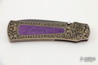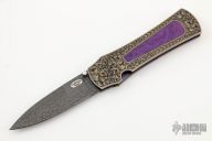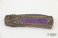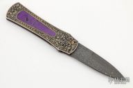 This linerlock folder by Stan Fujisaka features a Damascus blade has a false top edge and single thumbstud with mother of pearl inlay. The handle has anodized titanium scales with beautiful engraving on both sides by Bruce Shaw and chaorite inlays, anodized titanium liners with jeweled interiors, anodized titanium backspacer. Smooth action. The fit and finish is exceptional. Outstanding work. Excellent condition.