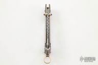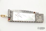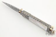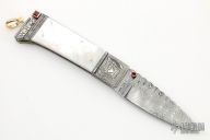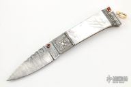 This "Big Beauty" by Dellana features a Damascus blade with fileworked spine and dual gold thumbstuds with ruby inlays. The handle has fluted Damascus bolsters, mother of pearl scales, gold pins, fileworked nickel silver liners, fileworked stainless steel backspacer with tail lock that has gold bezeled rubies, gold lanyard bail at the butt. Nice action, lockup and blade seating. Excellent condition. Dated 6-9-97