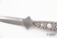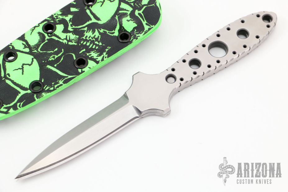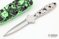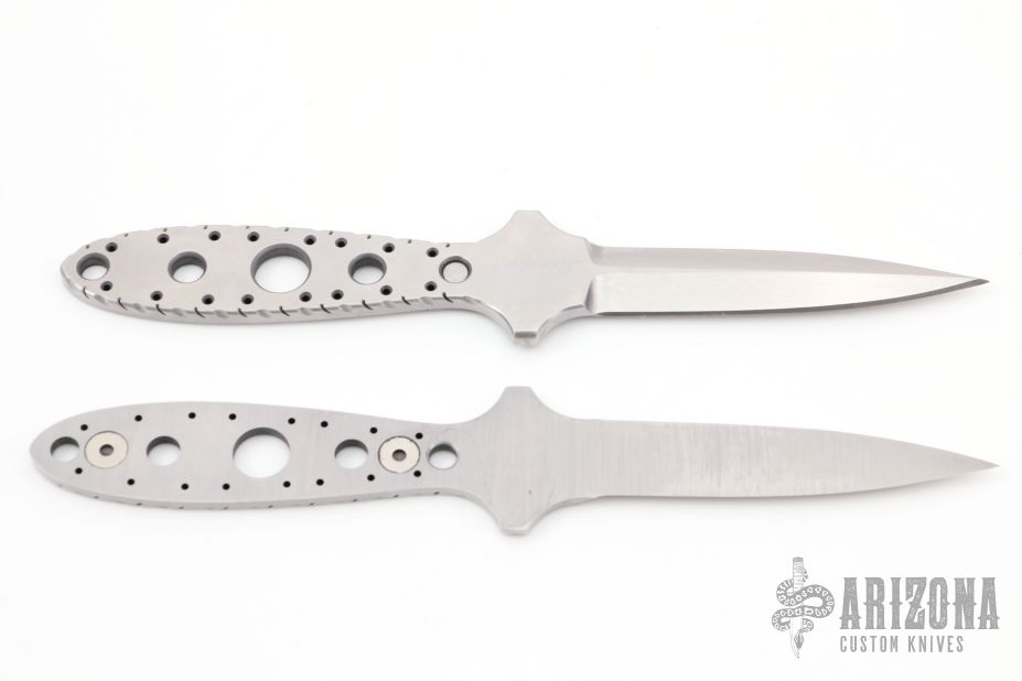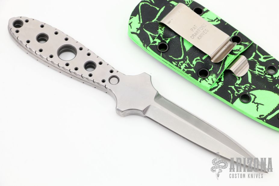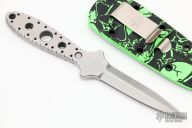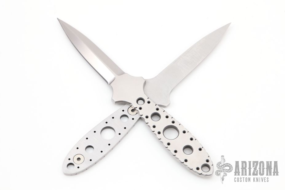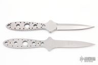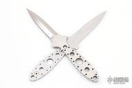This "Double Tap" dagger by Crawford Knives is two chisel ground daggers that attach together with magnets in the tang. Both blades are hand rub satin finished with fileworked and skeletonized tangs. Together they are .345" thick and .800" blade depth. Separated they are .170" thick. Comes with a kydex sheath with belt clip. New from maker.