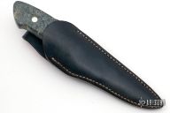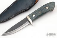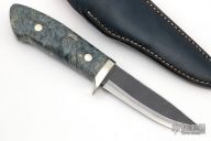 This sheath knife by Shosui Takeda features a Stainless Clad Aogami Super Steel (NAS) blade, .148" blade stock and 1.125" blade depth, hidden tang construction. The handle has nickel silver guard, box elder burl grip with nickel silver pins. Comes with a blue leather sheath. Handle by Moriya. New from maker.