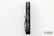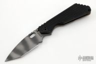 This SNG framelock folder by Mick Strider features a tiger stripe tanto blade and a dimple pattern black aluminum and flamed titanium frame and tip up titanium clip. Includes a "Lock Bar Stabilizer" for maximum reverse lock retention. Nice detent, lockup and blade seating. Has a couple light scuffs, otherwise excellent condition.