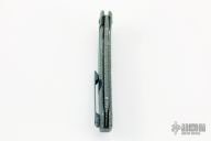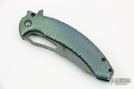 This Spinner by Gavko Knives features a tumble finished upswept blade with textured spine, thumbhole and flipper. The handle has a textured, anodized and tumble finished titanium frame with matching tip up clip and backspacer, black screws and pivot. Comes with zippered case. Nice detent, lockup and blade seating. Excellent condition.