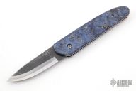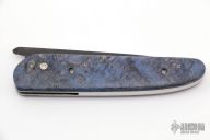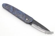 The Bitchu-no-Kami is a traditional Japanese-style folder. The blade is Stainless clad Aogami Super Steel (NAS) which is a high-carbon steel alloy with vanadium and is ground on both sides. Handle constructed of box elder burl wood scales with polished stainless steel liners and backspacer. Comes with blue leather sheath. New from maker.