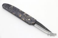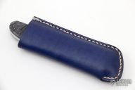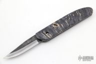 The Bitchu-no-Kami is a traditional Japanese-style folder. The blade is Stainless clad Aogami Super Steel (NAS) which is a high-carbon steel alloy with vanadium and is ground on both sides. Handle constructed of buckeye burl wood scales with polished stainless steel liners and backspacer. Comes with blue leather sheath. New from maker.