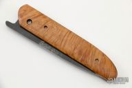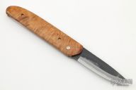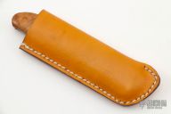 The Bitchu-no-Kami is a traditional Japanese-style folder. The blade is Stainless clad Aogami Super Steel (NAS) which is a high-carbon steel alloy with vanadium and is ground on both sides. Handle constructed of masur birch wood scales with polished stainless steel liners and backspacer. Comes with tan leather sheath. New from maker.