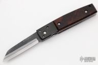 This Inagaki Linerlock Folder features a Stainless clad Aogami Super Steel (NAS) blade which is a high-carbon steel alloy with vanadium and is ground on both sides. The handle has carbon fiber bolsters, ironwood scales with polished stainless steel liners. New from maker.
