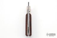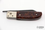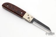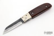This Inagaki Linerlock Folder features a Stainless clad Aogami Super Steel (NAS) blade which is a high-carbon steel alloy with vanadium and is ground on both sides. The handle has textured nickel silver bolsters, ironwood scales with polished stainless steel liners. New from maker.