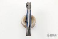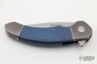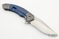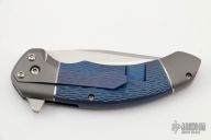 This Custom Lahar by Tim Galyean features a hand rub satin finished blade with notched flipper and thumbrest. The handle has a two-tone jigged titanium frame with a matching tip down clip. Rides on bearings, nice detent, lockup and blade seating. Comes with a Velcro case. Excellent condition.