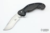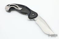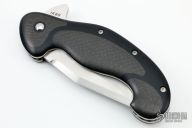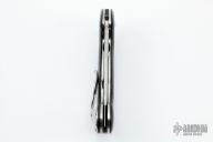 This Front Line linerlock flipper by Todd Begg features a hand-rubbed satin finish blade with checkered thumbrest and flipper. The handle has black G-10 scales with lightning strike carbon fiber inlays. Liners, and clip are titanium and have a jeweled ice texture. Black G-10 backspacer. Includes IKBS (Ikoma-Korth Bearing System) for smooth and fast flipper opening that requires no wrist action. Nice blade seating, lockup, and detent. Outstanding work. Excellent condition. Comes with a zippered case.