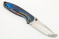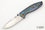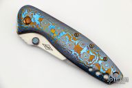 This Nitro by Peter Carey features a hand rub satin finished blade with notched thumbrest and dual timascus thumbstuds. The handle has timascus scales and tip down clip. Nice lock up, blade seating and detent. Excellent condition. Comes with a velcro case.