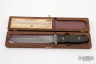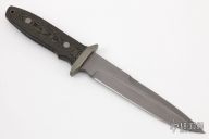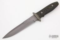 This Model 36 Battlemate by Bob Terzuola features a bead blasted blade with a sharpened top edge and notched thumbrest, .262" blade stock and 1.233" blade depth, hidden tang construction. The handle has a bead blasted titanium guard, black linen micarta grip with lanyard hole. Comes with original wooden box and COA #118H. Has a few light scuffs, otherwise excellent condition.