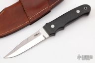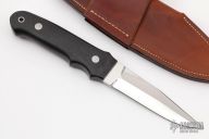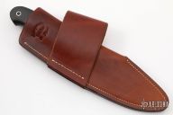 This Hideout by David Sharp is a Bob Loveless design. Mirror finish blade with a sharpened top edge, hidden/mortise tang construction, .200" blade stock and 1.075" blade depth. The handle has a carbon fiber guard and carbon fiber scales with a red spacer between. Comes with brown leather sheath. Excellent condition.