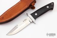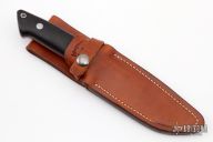 This Loveless Style Chute Knife by David Sharp features a mirror polished then tumble finished blade with a 2" sharpened top edge, .208" blade stock and 1.090" blade depth, full tapered tang construction. The handle has a satin finished stainless steel guard, rag micarta scales with red liners. This micarta came from the Loveless Shop. Comes with a brown leather sheath. Excellent condition.