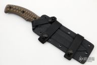 The full-tang handle features super durable and grippy 3D contoured G10 handle scales. G-10 is a superior handle material compared to the old stacked leather handles or Bakelite style of yesteryear. The G10 material provides a sure grip in any weather or climate condition. A Kydex scabbard is included with two MAD straps for belt or pack carry.