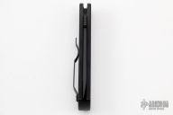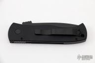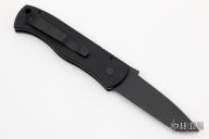 This Emerson/Pro-Tech CQC7 automatic has a chisel ground black sterile blade with a plain edge and a solid black aluminum handle with a tritium push button insert.  Black stainless steel clip. Coil spring. Comes with original box and papers. New from maker.
