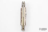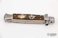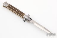 This 9" Picklock by Frank Beltrame features a polished bayonet ground blade with false top edge. The handle has stainless steel bolsters, front and rear, stag scales, brass liners, stainless spring. Excellent condition.