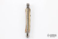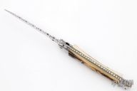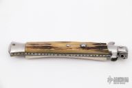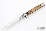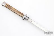 This 11" Picklock by Frank Beltrame features a polished blade with fileworked spine. The handle has stainless steel bolsters, front and rear, stag scales, brass liners, stainless spring, dimpled backspacer. Has some scratches, otherwise excellent condition.