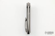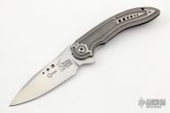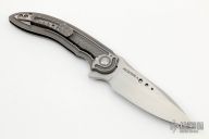 This Knife by Flavio Ikoma is "Prototype A", it features a hand rub satin finished blade with notched thumbrest and flipper. The handle has a two-tone titanium frame with milled reliefs, two tone titanium screws, matching tip up clip, black G-10 backspacer. Inside of frame has been jeweled. Rides on IKBS, nice detent, lockup and blade seating. Comes with Velcro case. Excellent condition.