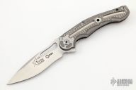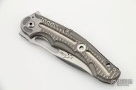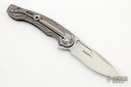 This Knife by Flavio Ikoma is "Prototype C", it features a hand rub satin finished blade with notched thumbrest and flipper. The handle has a two-tone titanium frame with milled reliefs, matching tip up clip, black G-10 backspacer. Inside of frame has been jeweled. Rides on IKBS, nice detent, lockup and blade seating. Comes with Velcro case. Excellent condition.