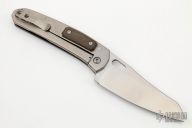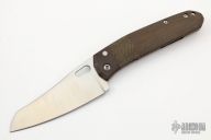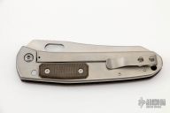 This KUF framelock folder is a Liong Mah design, made by Eddie Baca. The knife features a satin finished blade with thumb hole and notched thumbrest. The handle has an OD Green canvas micarta and orange peel finish titanium frame. Orange peel titanium clip. Smooth action. Nice blade seating, detent, and lockup. Excellent condition.