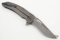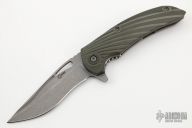 This framelock flipper by Mikkel Willumsen features a bead blasted blade with notched thumbrest, thumbhole and flipper. The handle has a bead blasted titanium frame with a green G-10 scale, tip up anodized titanium clip. Includes IKBS (Ikoma-Korth Bearing System) for smooth and fast flipper opening that requires no wrist action. Nice detent, blade seating and lockup. Excellent condition.