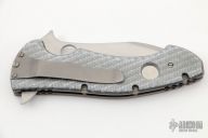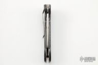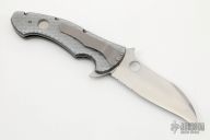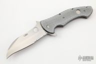 This older flipper by Andre De Villiers features a hand rub satin finished partially serrated blade with thumbhole and flipper. The handle has silver twill scales, bead blasted titanium liners and tip down clip. Nice detent, lockup and blade seating. Has a small scuff on the clip, otherwise excellent condition.