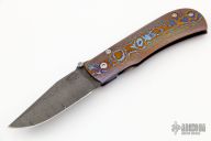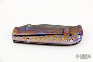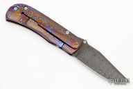This Framelock Folder by David Winston features a Damascus blade with notched thumbrest and single thumbstud. The handle has a full Timascus frame with a matching tip down clip. Nice detent, blade seating and lockup. Comes with a Velcro case. Excellent condition.