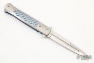 This Stiletto linerlock flipper by Phil Boguszewski features a hand-rubbed satin finish blade with fullers and false top edge. The handle has an anodized and orange peel finished titanium frame with milling work on both sides. Excellent flipper opening that requires no wrist action. Nice blade seating, detent, and lockup. Outstanding fit and finish. Numbered 1 on blade. Excellent condition.