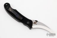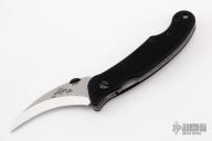This Elvia by Emerson Knives features a stonewashed hawkbill blade with thumbdisc. The handle has black G-10 scales, titanium liners and a black stainless steel tip up clip with sneak reaper. Comes with original box and papers, and original Emerson clip. New condition.