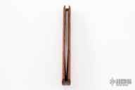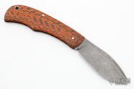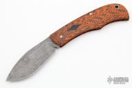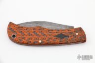 This slipjoint by Chris Taylor features an acid finished blade with false top edge. The handle has orange/black carbon fiber covers and a carbon fiber escutcheon.  Has half-stop. Includes a padded zippered case.  Light scratches are visible on the blade otherwise the knife is in Excellent Condition.