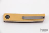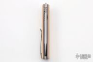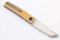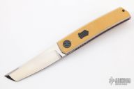 This Tachi Front Flipper by Jared Oeser features a AEB-L satin finished tanto blade with false top edge. The handle has Westinghouse micarta scales, layered G-10 liners/backspacer and a carbon fiber escutcheon.  Titanium tip down pocket clip.  Nice detent, lockup and blade seating. Comes with COA dated Mar 16, 2022. Comes with a custom hank with Jared's logo and original packaging. New from maker!