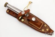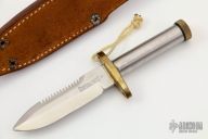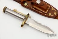 The Model 18 Mini by Randall Made Knives, features a satin finished blade with sawteeth, brass fittings, and stainless steel handle (no knurling). Approximately 300 made. .122" Blade Stock .867" Blade Depth. Includes screw on butt cap for survival kit storage. Comes with a brown leather sheath by F.W. Byrd. Has a few light scratches, otherwise excellent condition.