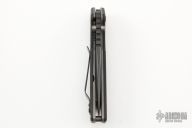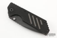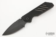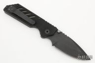 This AR folder by Strider for Triple Aught Design features a black oxide finish clip point blade with dual thumbstuds and a notched thumbrest. The handle has textured G10 scales, tumbled titanium liners and black stainless clip. Notches on thumbrest, lockup and rear of handle. Marked c17 on the blade. Has a couple light scuffs on the blade and handle otherwise excellent condition.