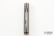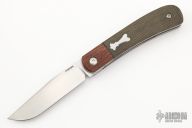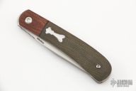 This Front Flipper by Enrique Pena features a hand rub satin finished clip point blade with swedge, notched thumbrest and front flipper. The handle has natural canvas micarta bolsters and green canvas micarta scales, black liners, titanium liners, canvas micarta backspacer. Includes padded and zippered case. New from maker!