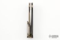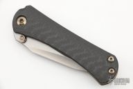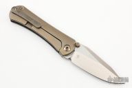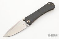 This SBDP by Borka Blades features a stonewash finished blade with dual thumbstuds. The handle has a carbon fiber and stonewashed and anodize finish titanium frame with a matching tip up clip. Nice detent, lockup and blade seating. Comes with COA dated 2021. Excellent condition.