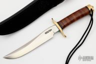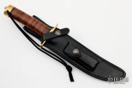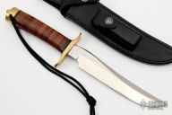This Model 3-7 Recon Style Fighter by Randall Made Knives features a satin finished blade with a sharpened top edge, .217" blade stock and 1.212" blade depth, hidden tang construction. The handle has brass a brass guard and butt with a stacked leather grip, black spacers. Comes with a black leather sheath. Excellent condition. The blade and sheath are both marked #057