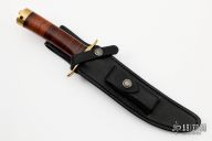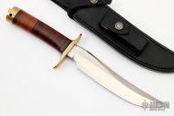 This Model 3-7 Recon Style Fighter by Randall Made Knives features a satin finished blade with a sharpened top edge, .215" blade stock and 1.273" blade depth, hidden tang construction. The handle has brass a brass guard and butt with a stacked leather grip, black spacers. Comes with a black leather sheath. Excellent condition. The blade and sheath are both marked #088