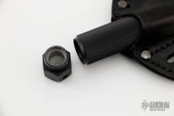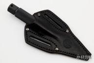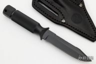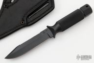 This Aviator by Chris Reeve has a black blade with false top edge and sawteeth, .174" blade stock and .868" blade depth, integral construction with hollow handle. Comes with original black leather sheath. #591 on the blade. Excellent condition.