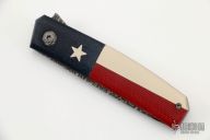 This Tengu OS flipper by Jared Oeser features a stainless intrepid Damascus blade with flipper tab. The handle has a bead blasted titanium frame with Texas theme over red liners. Mokuti floating backspacer. Nice detent, lockup and blade seating. Comes with original box, black leather pocket sheath, hank and COA dated 3/16/2022. New from maker at the 2022 Texas Bladeshow.