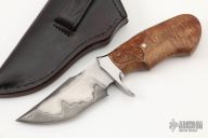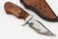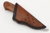 This Defender by Journeyman Smith Ben Seward features a San-Mai blade (W1 Core 410 Clad) with sharpened top edge, .236" blade stock and 1.28" blade depth, hidden tang construction. The handle has a stainless steel guard, stabilized Koa grip with single nickel silver pin. Carved and Checkered handle. Comes with a hand tooled brown leather sheath. New from Maker at the 2022 Texas Bladeshow.