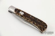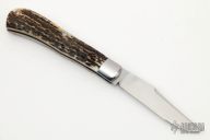 This Single Blade Trapper by Tim Robertson features a hand rub satin finished blade with nail nick and false top edge. The handle has stainless steel bolsters, stag covers, stainless steel liners and spring. Has half-stop, flush in all positions. Comes with a zippered case. New from maker.