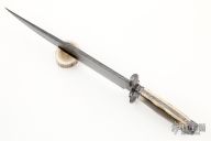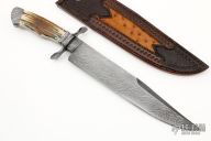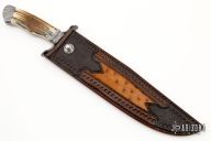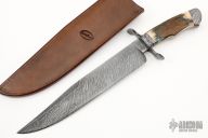 This Integral Frame Damascus Bowie by Journeyman Smith Ben Seward features a 1075/15N20 Twisted W's Damascus clip point blade with: sharpened top edge, .259" blade stock and 1.79" blade depth, hidden tang construction with integral frame handle. The handle has a matching Damascus fittings, and Fossil Mammoth scales. Comes with a hand tooled black leather sheath made by David Seward. New from maker.
