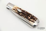 This two blade trapper by Bill Ruple features two hand rub satin finished blades with nail nicks. The handle has steel bolsters, stag covers, fileworked stainless steel liners, fileworked stainless steel springs. Half stop blade positioning on both blades, flush in all positions. Includes a padded zippered case.  New from maker!