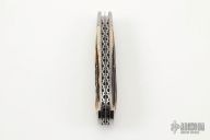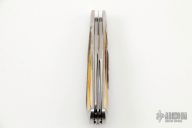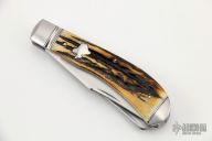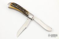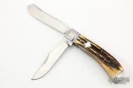 This Two-Blade trapper by Tobin Hill features hand rub satin finished blades with a nail nicks. The handle features pinched, fluted and threaded stainless steel bolsters, stainless steel liners with fileworked spines, stag covers with a stainless steel escutcheon, fileworked stainless steel springs. Has half-stop, flush in all positions. Includes a padded zippered case. New From Maker at the 2022 Blade Show Texas.