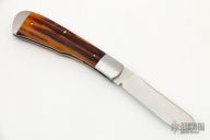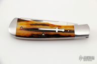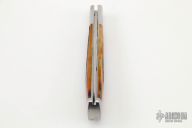 This Gunstock by Kabisch Custom Knives features a hand rub satin finished blade with nail nick. The handle has stainless steel bolsters and liners, amber stag covers with stainless steel sword escutcheon, stainless steel spring. Has half stop, flush in all positions. Comes with a zippered case. New from maker at the 2022 Blade Show Texas.