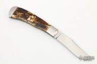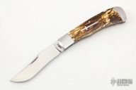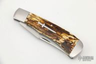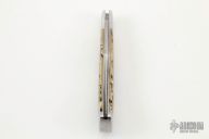 This Trapper by Kabisch Custom Knives features a hand rub satin finished blade with nail nick. The handle has stainless steel bolsters and liners, mammoth ivory covers with stainless steel sword escutcheon, stainless steel spring. Has half stop, flush in all positions. Comes with a zippered case. New from maker at the 2022 Blade Show Texas.