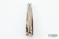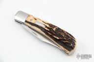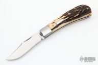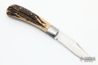 This Slipjoint by Jeff Hawkins features a satin finished blade with nail nick. The handle has pinched stainless steel bolsters, stag covers with a stainless steel escutcheon, stainless steel liners and spring. Has half-stop, flush in all positions. Comes with a zippered case. New from maker at the 2022 Blade Show Texas.