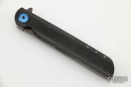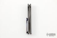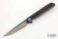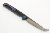 This Scamp by Matthew Lerch features a DLC mirror finished CPM154 blade with satin flats and notched flipper. The handle has zirconium scales and backspacer, bead blasted stainless steel liners, tip up MokuTi clip with hidden screws. Rides on bearings, nice detent, lockup and blade seating. Comes with a velcro case. Has some scratches, otherwise excellent condition.
