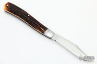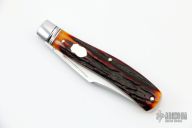 This slipjoint by David R Davis features a hand rub satin finished blade with nail nick. The handle has threaded and fluted stainless steel bolsters, amber sambar stag covers with nickel silver escutcheon, coin edged and fileworked stainless steel liners and and fileworked stainless steel spring. Has half-stop, flush in all positions. Comes with a zippered case and COA dated Oct 2021 and #142. New from maker at the 2022 Blade Show Texas.
